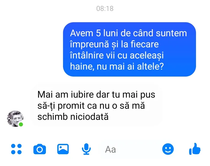 – Avem 5 luni de când suntem împreună și la fiecare întâlnire vii cu aceleași haine, nu mai altele?