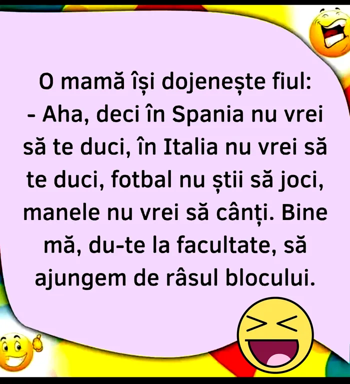 – Aha, deci în Spania nu vrei să te duci, în Italia nu vrei să te duci, fotbal nu știi să joci, manele nu vrei să cânți… bine, atunci dă la facultate, să ajungem de râsul blocului!