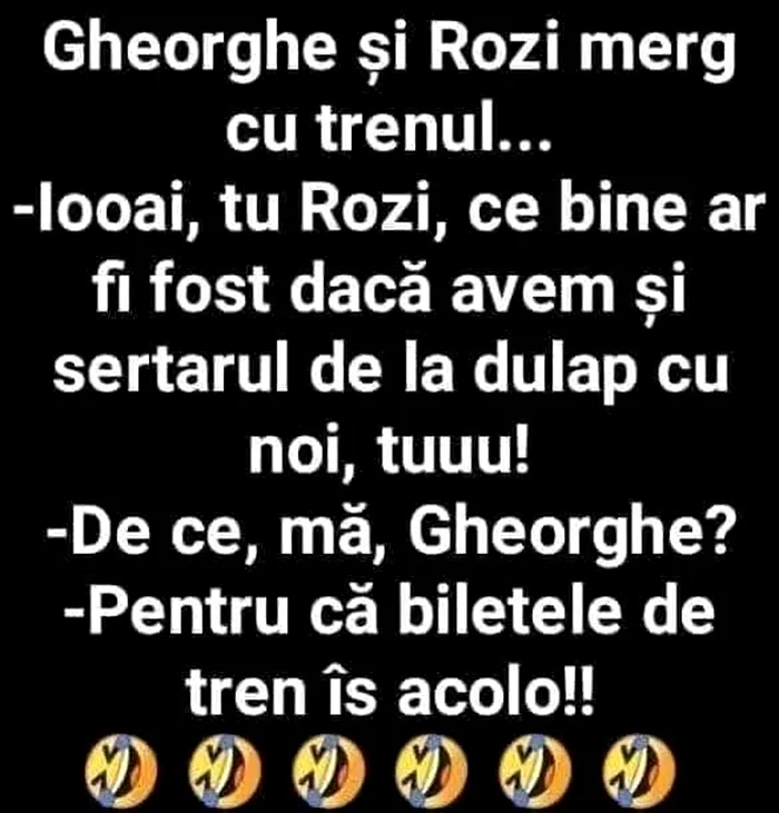-Iooai, tu Rozi, ce bine ar fi fost dacă aveam și seertarul de la dulap cu noi, tuuu!