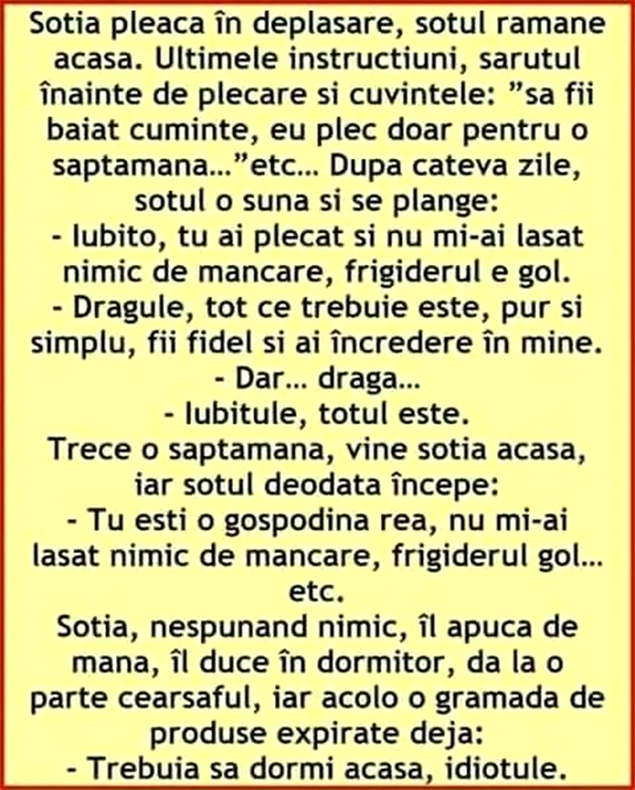 Știi bancul cu soția care pleacă în deplasare, iar soțul rămâne acasă? Și urmează ultimele instrucțiuni, sărutul înainte de plecare, apoi cuvintele…