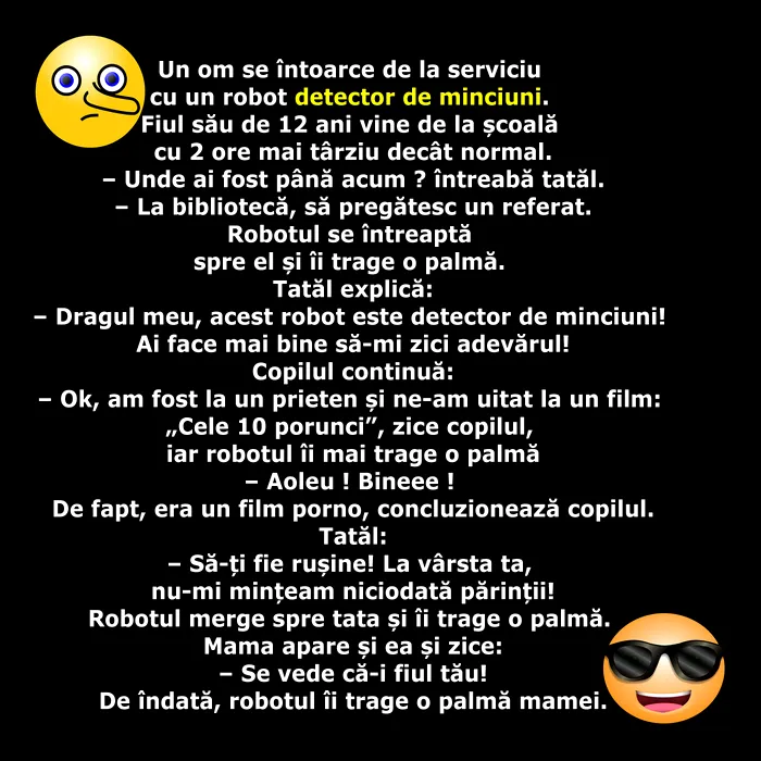– Dragul meu, acest robot este detector de minciuni! Ai face mai bine să-mi zici adevărul!