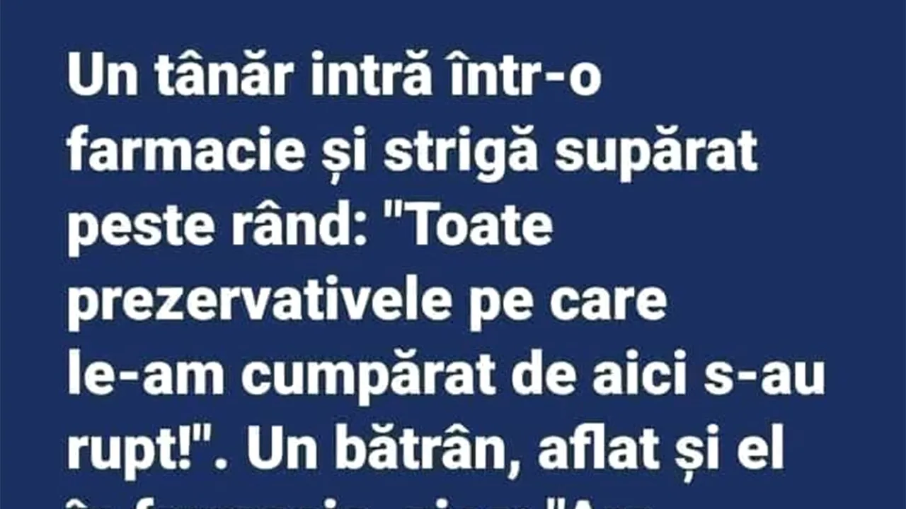 Un tânăr intră într-o farmacie și strigă supărat peste rând: ”Toate prezervativele pe care le-am cumpărat de aici s-au rupt!”. Un bătrân, aflat și el în farmacie, zice: ”Are dreptate băiatul! Și ale mele, toate se îndoaie!”