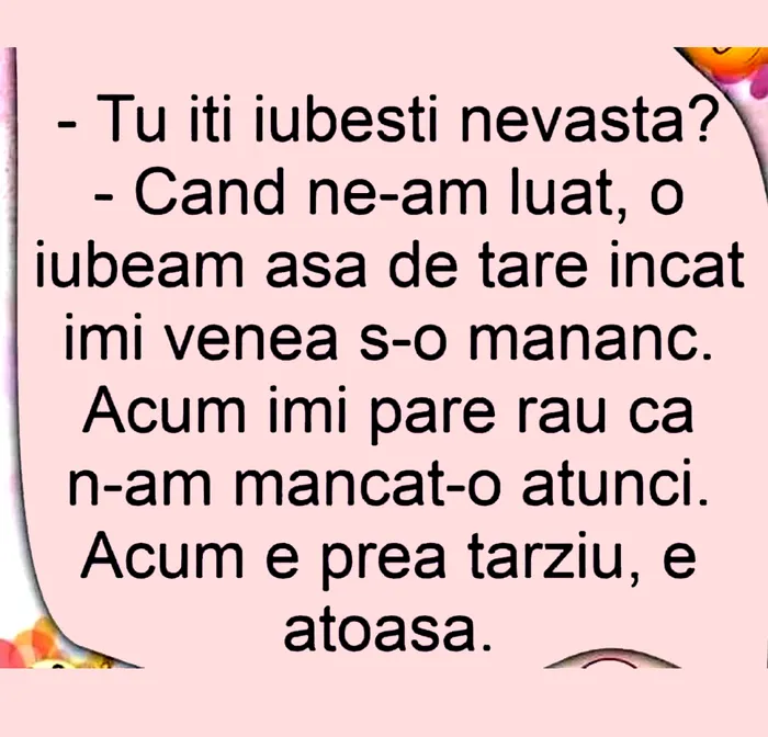 – Când ne-am luat, o iubeam așa de tare încât îmi venea să o mănânc. Acum, îmi pare rău că n-am mâncat-o atunci.