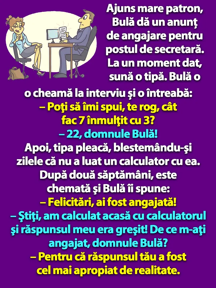 – Ştiţi, am calculat acasă cu calculatorul şi răspunsul meu era greşit! De ce m-aţi angajat, domnule Bulă?