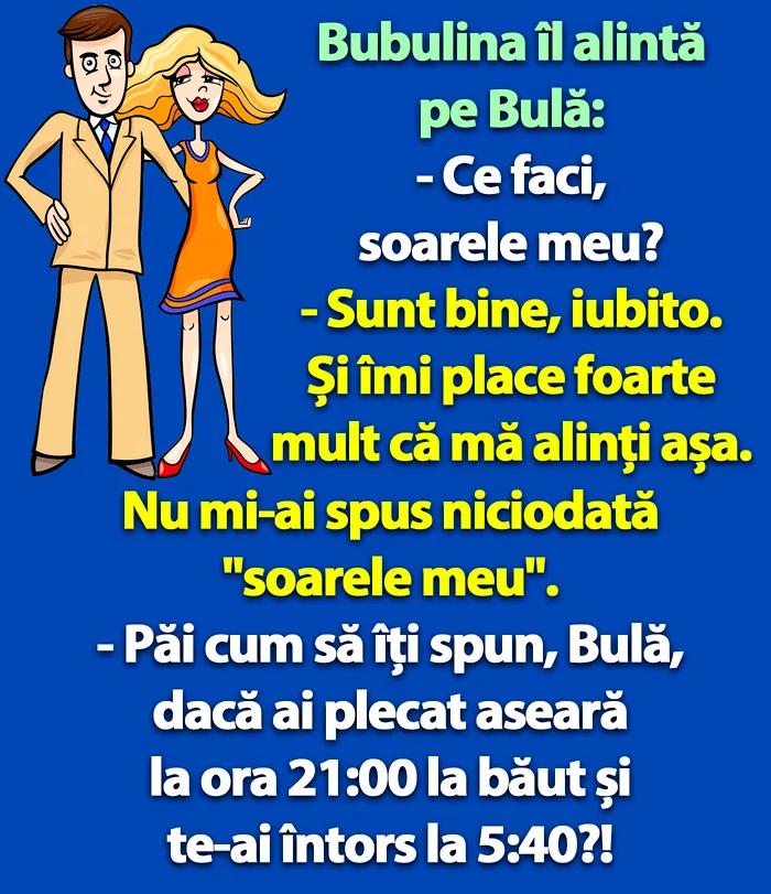 – Păi cum să îți spun, Bulă, dacă ai plecat aseară la ora 21:00 la băut și te-ai întors la 5:40?!