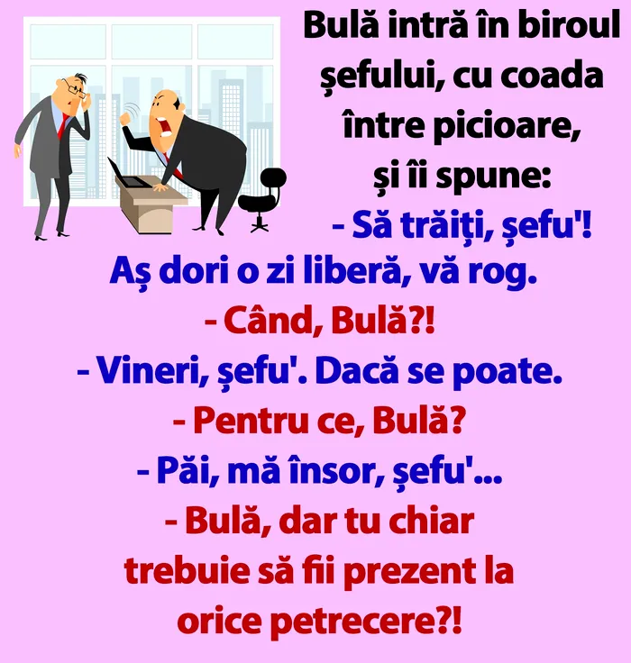 Bulă intră în biroul șefului, cu coada între picioare, și îi spune: