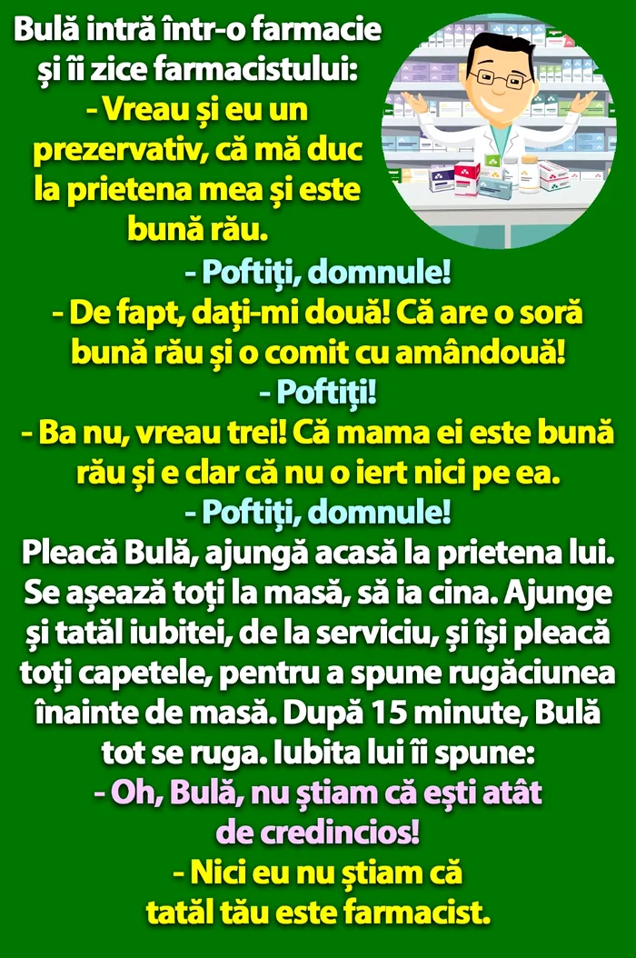 Bulă intră într-o farmacie și îi zice farmacistului: