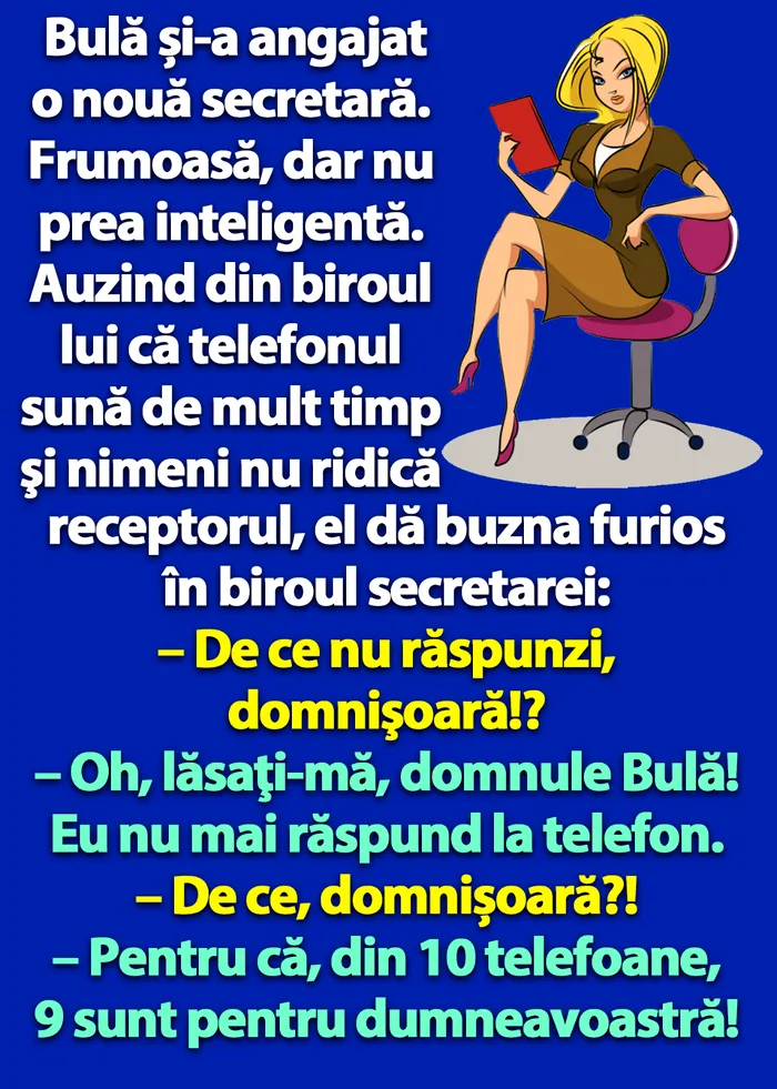 Bulă și-a angajat o nouă secretară. Frumoasă, dar nu prea inteligentă. Auzind din biroul lui că telefonul sună de mult timp şi nimeni nu ridică receptorul, el dă buzna furios în biroul secretarei:
