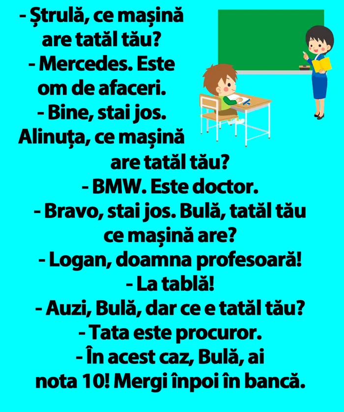 Prima pagină » Bancuri » BANCUL nopții | La școală: „Bulă, ce mașină are tatăl tău?”