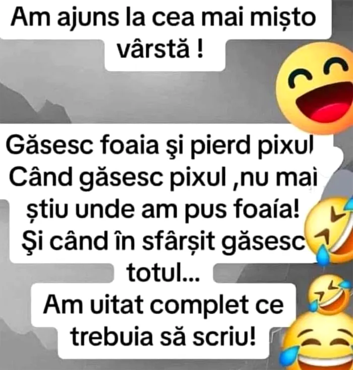 Săptămâna de lucru devine întotdeauna mai ușoară dacă ne destindem cu momente amuzante. Redacția „Gândul” vă oferă un banc de împărtășit cu cei dragi: „Am ajuns la cea mai mișto vârstă”.