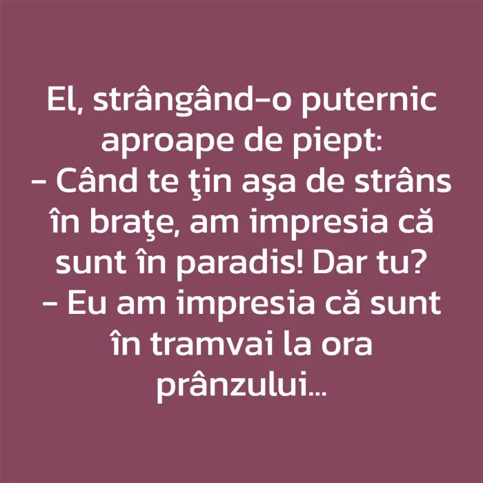 – Când te țin așa de strâns în brațe, am impresia că sunt în paradis! Dar tu?