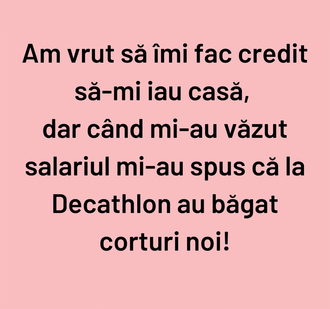 Am vrut să îmi fac credit să-mi iau casă, dar când mi-au văzut salariul mi-au spus că la Decathlon au băgat corturi noi.