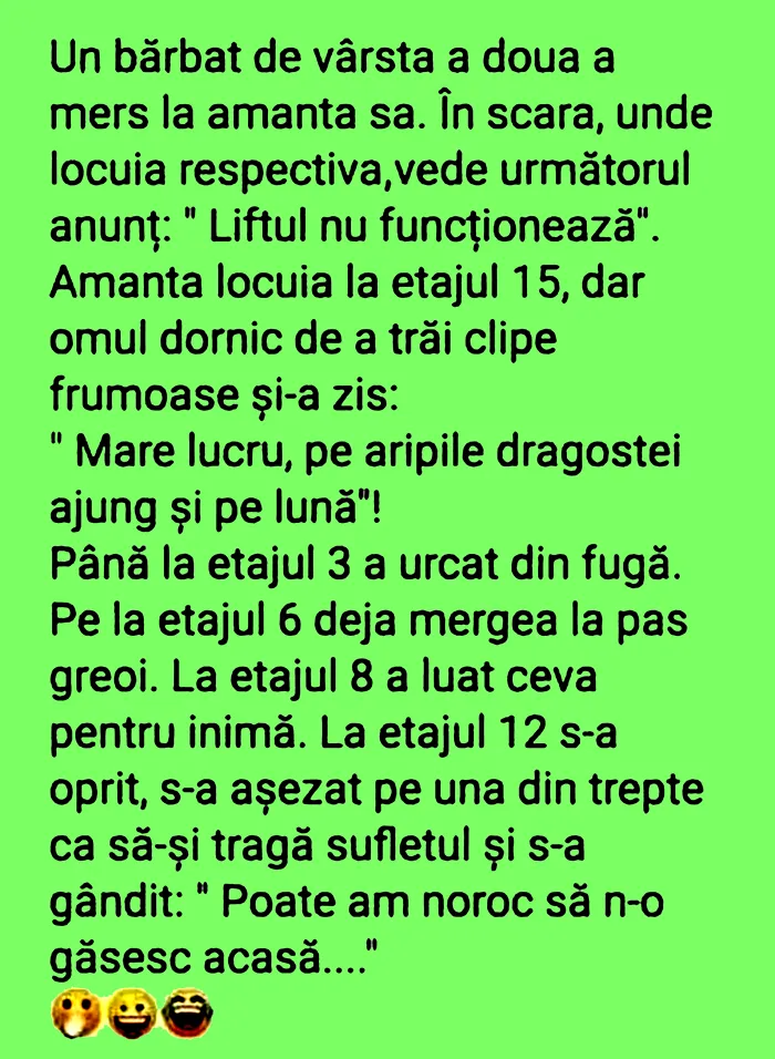 Un bărbat de vârsta a doua a mers la amanta sa. În scara, unde locuia respectiva vede următorul anunt: „Liftul nu functionează”.