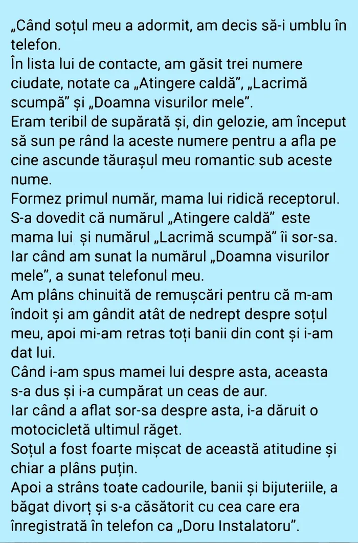 Când soțul meu a adormit, am decis să-i umblu în telefon. În lista cu contacte am găsit trei numere ciudate, notate ca „Atingere caldă”, „Lacrimă scumpă” și „Doamna visurilor mele”.