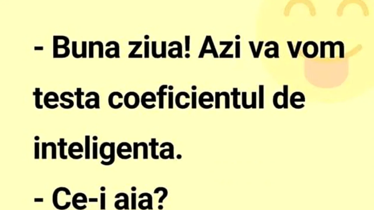 Redacția GÂNDUL îți oferă un banc amuzant pentru a-ți aduce zâmbetul pe buze toată ziua. „Azi vă vom testa coeficientul de inteligență”.