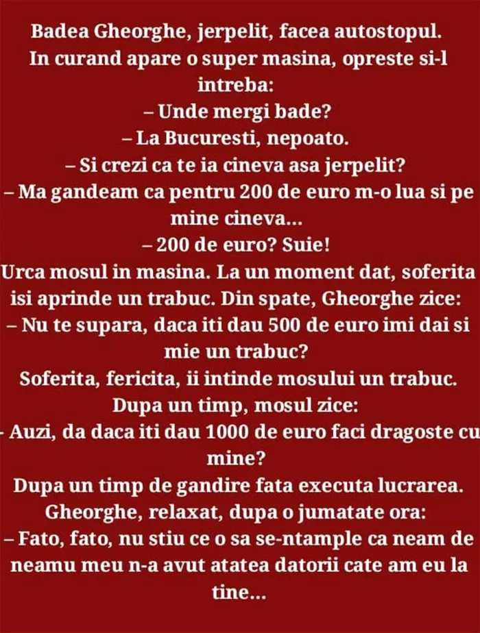Badea Gheorghe, jerpelit, făcea autostopul. În curând apare o super-maşină, oprește şi-l întreabă: