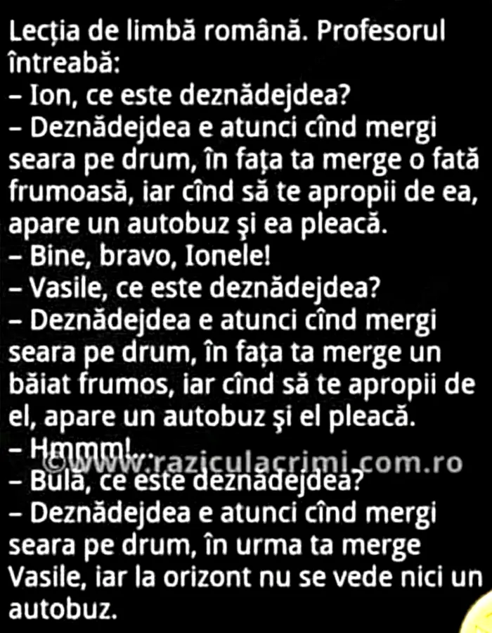 – Deznădejdea e atunci când mergi seara pe drum, în fața ta merge o fată frumoasă, iar când să te apropii de ea, apare un autobuz și ea pleacă.