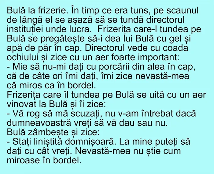 Bulă la frizerie. În timp ce era tuns, pe scaunul de lângă el se așază să se tundă dorectorul instituției unde lucra. Frizerița care-l tundea pe Bulă se pregătește să-i dea lui Bulă cu gel și apă de păr în cap.
