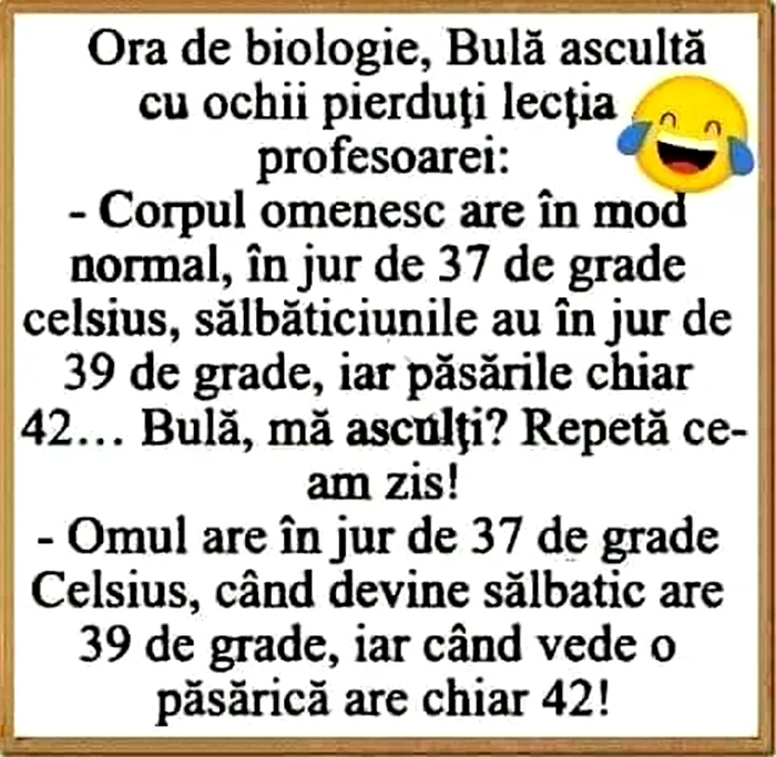 – Corpul omenesc are, în mod normal, în jur de 37 de grade Celsius, sălbăticiunile au în jur de 39 de grade, iar păsările chiar 42… Bulă, mă asculți? Repetă ce am zis!