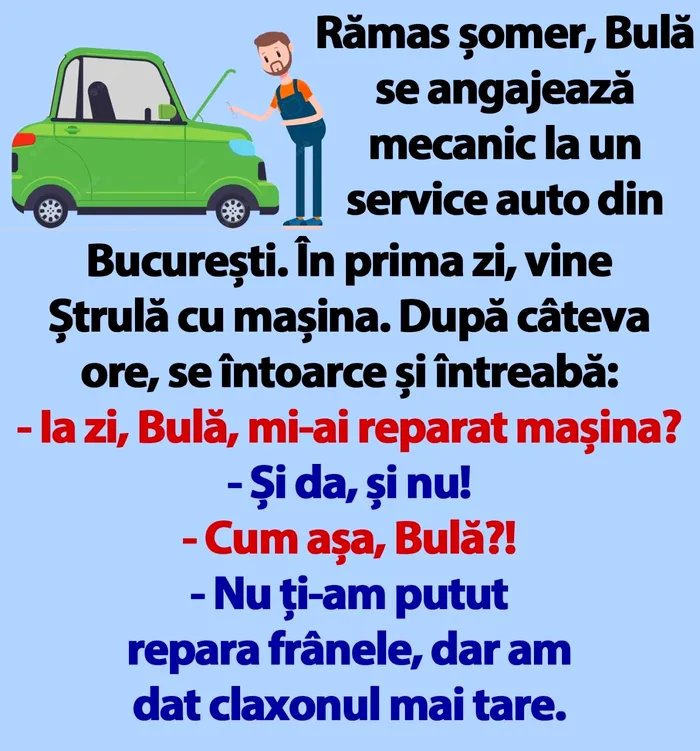 – Nu ți-am putut repara frânele, dar am dat claxonul mai tare.