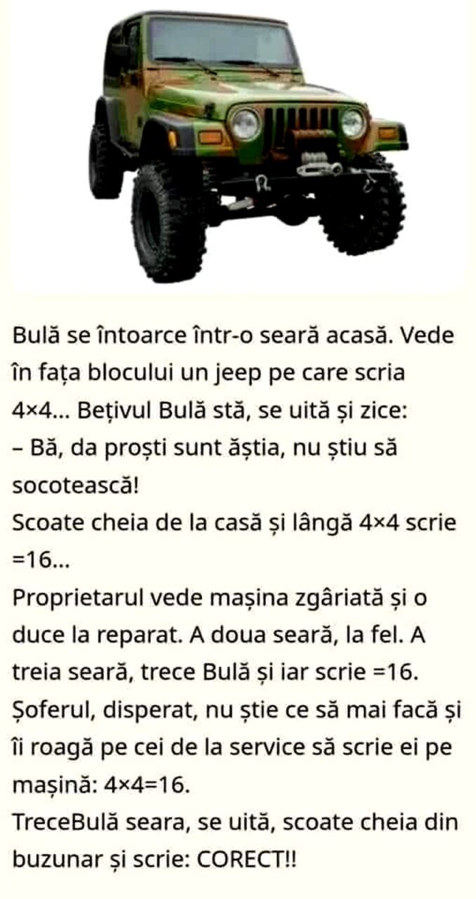 Bulă se întoarce într-o seară acasă. Vede în fața blocului un jeep pe care scria 4×4… Bețivul Bulă stă, se uită și zice: