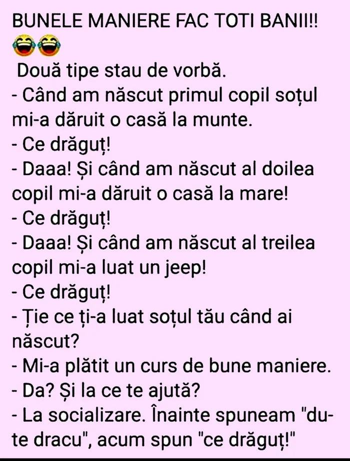 Ziua de marți trebuie continuată cu voie bună și zâmbete. Iar distracție vine la pachet cu un banc bun, pe care vi-l aduce GÂNDUL.RO. Când două tipe stau de vorbă, descoperim de ce bunele maniere fac toți banii.