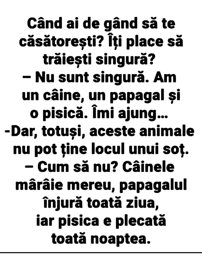 – Cum să nu? Câinele mârâie mereu, papagalul înjură toată ziua, iar pisica e plecată toată noaptea.