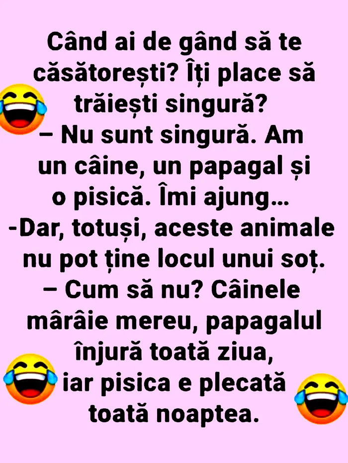 – Cum să nu? Câinele mârâie mereu, papagalul înjură toată ziua, iar pisica e plecată toată noaptea.