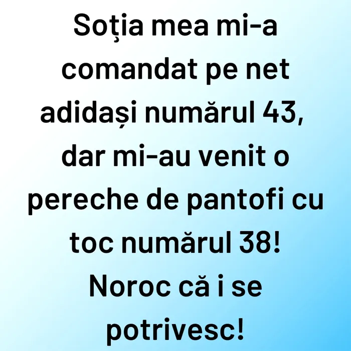 Soția mea mi-a comandat pe net adidași numărul 43, dar mi-a venit o pereche de pantofi cu toc, numărul 38! Noroc că i se potrivesc!