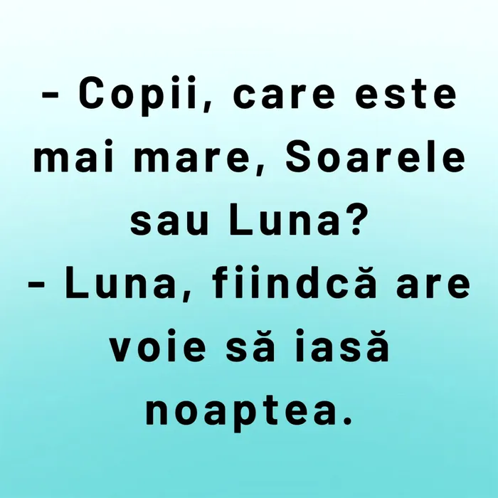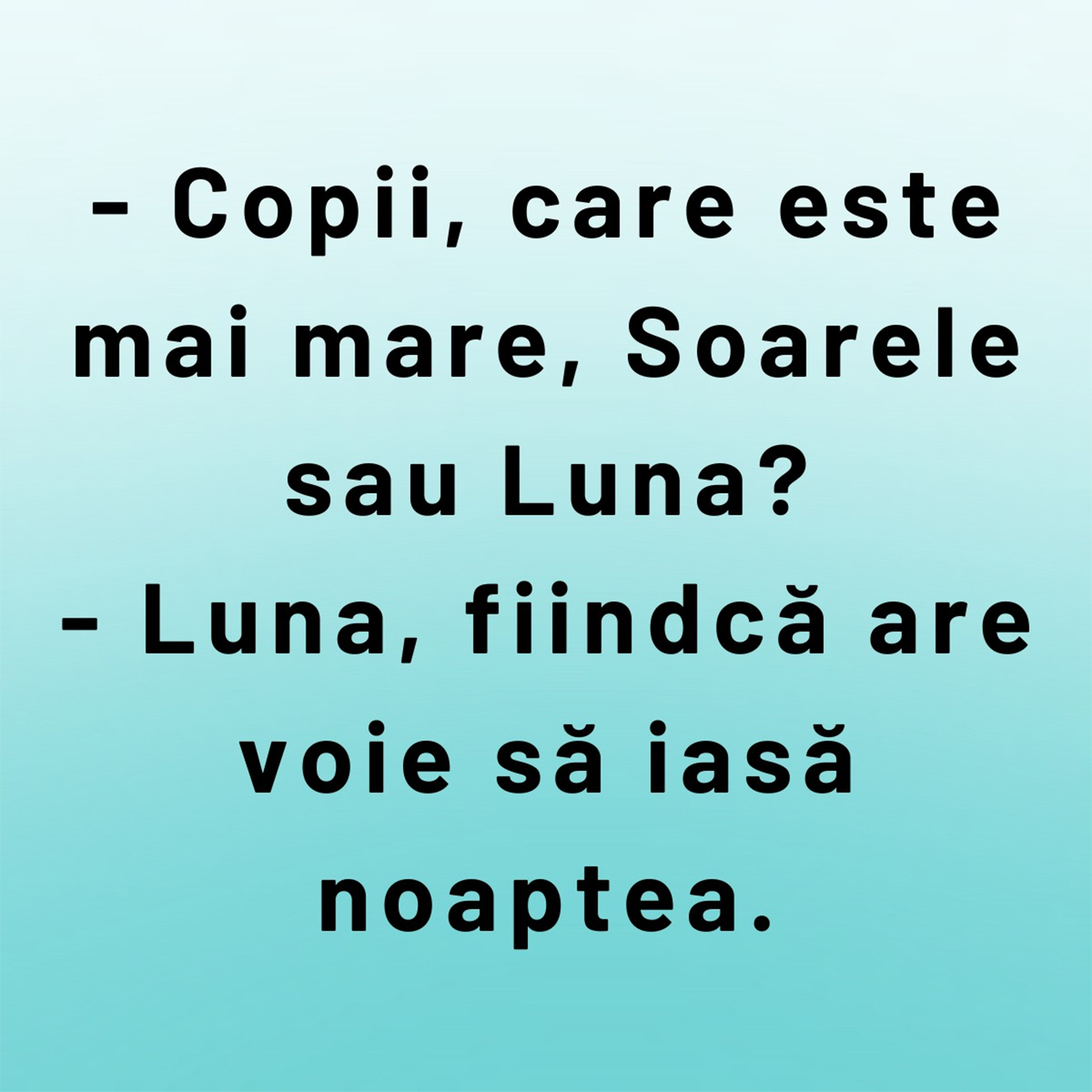 Dacă e vineri, vă propunem un nou banc spumos. La întrebarea: „Care este mai mare: Soarele sau Luna?”, copiii au data un răspuns total neașteptat.