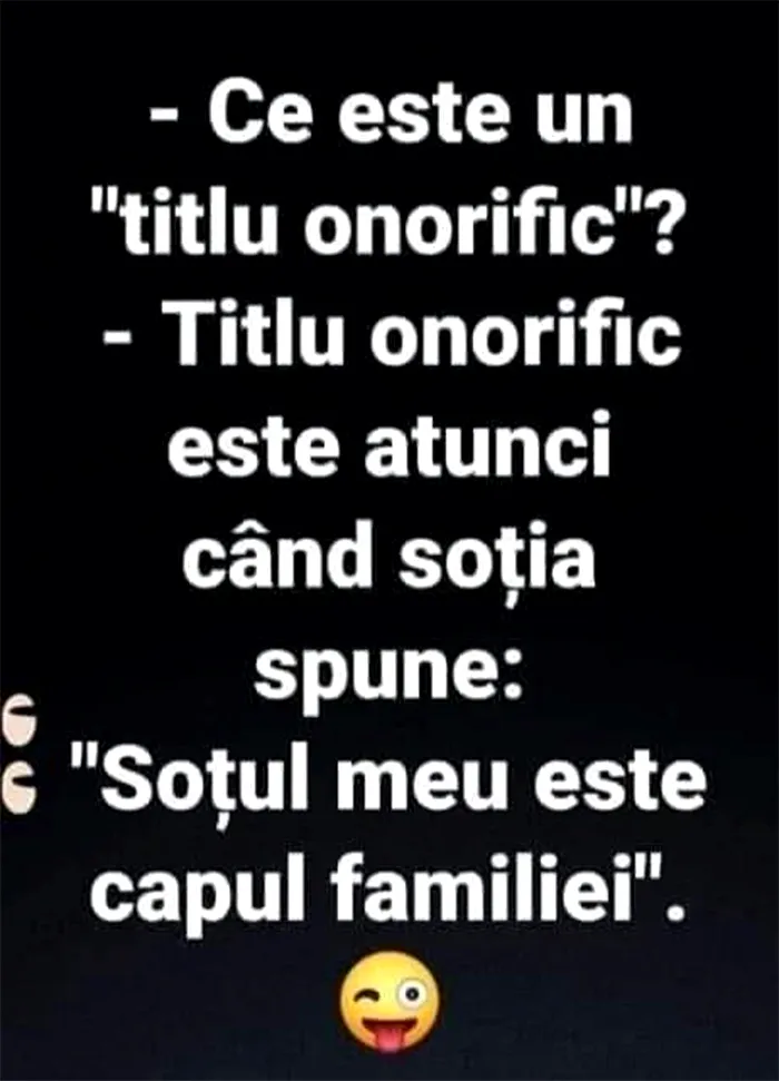 Bancul acestei zilei este despre armonia în familie sau, mai bine spus, despre „ce înseamnă titlul onorific, de fapt”, într-o căsnicie!
