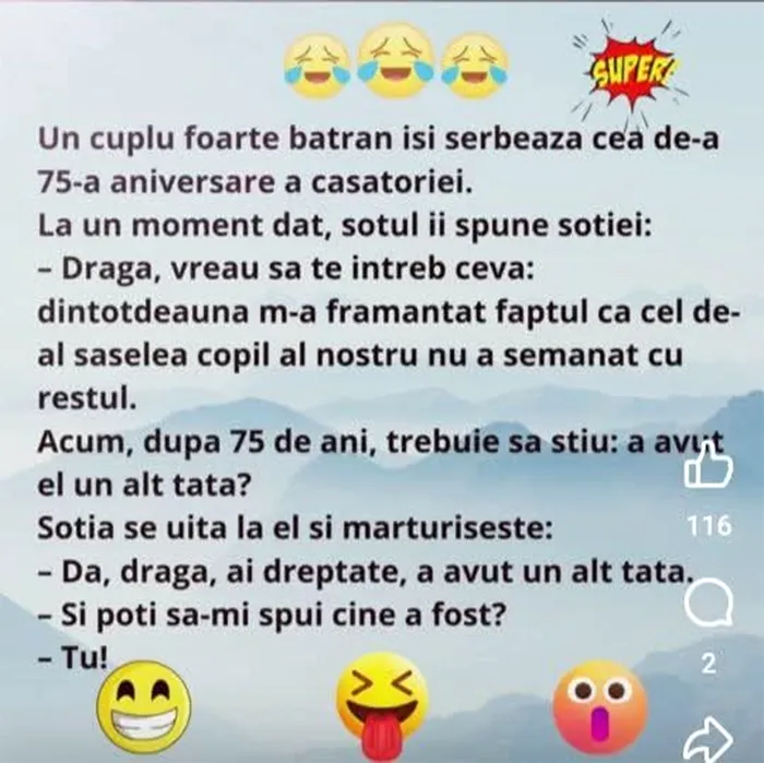 – Dragă, vreau să te întreb ceva: dintotdeauna m-a frământat faptul că cel de-al șaselea copil al nostru nu a semănat cu restul. Acum, după 75 de ani, trebuie să știu: a avut el un alt tată?