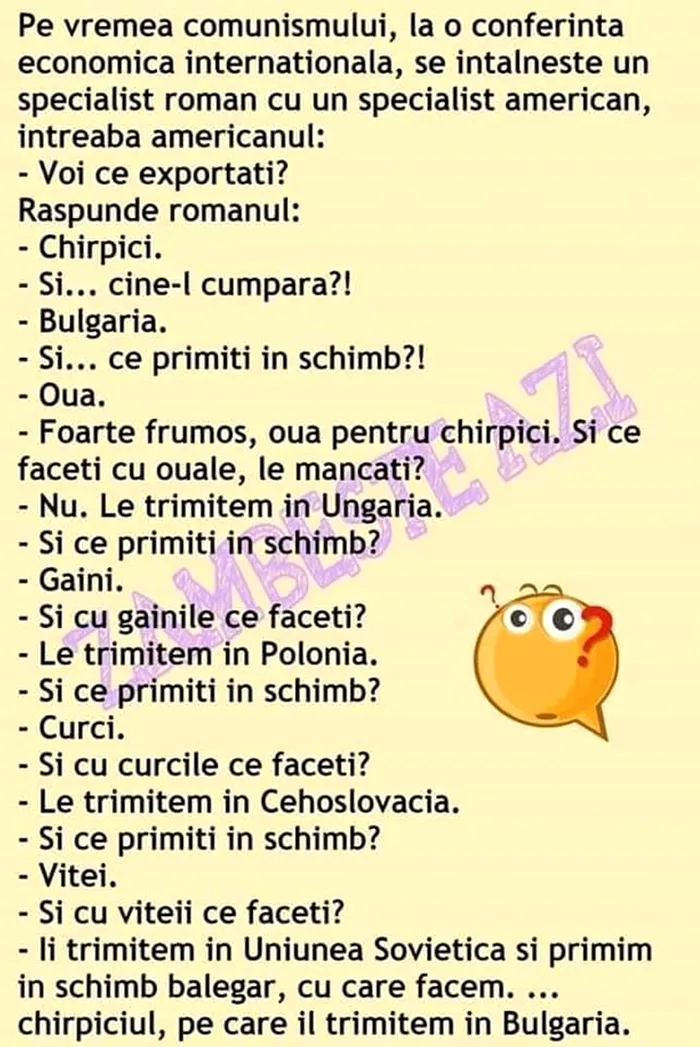 Pe vremea comunismului, la o conferinţă economică internaţională, un specialist român se întâlneşte cu un specialist american, care – la un moment dat – are o curiozitate…
