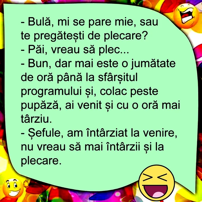 – Șefule, am întârziat la venire, nu vreau să mai întârzii și la plecare.