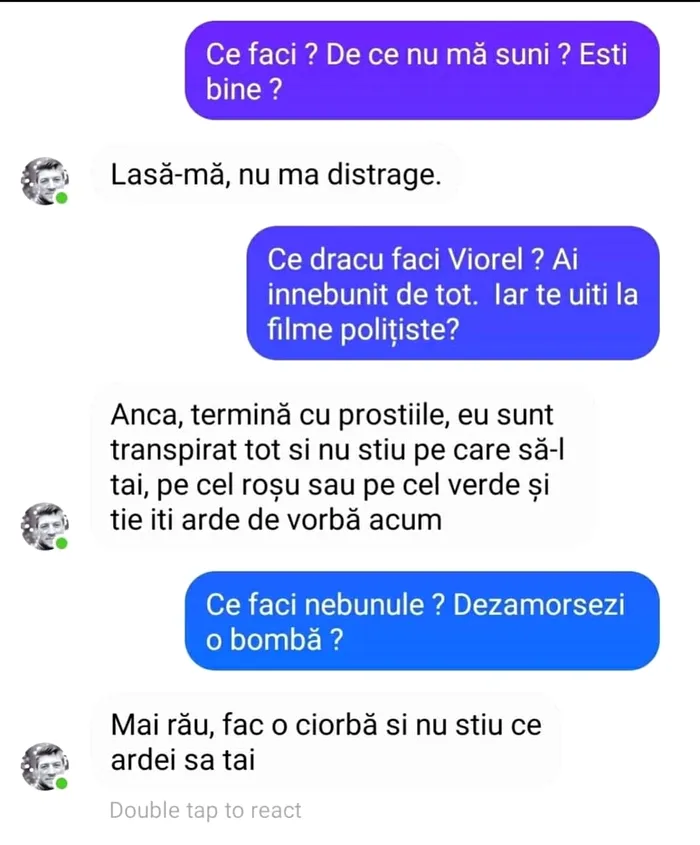 – Anca, termină cu prostiile, eu sunt transpirat tot și nu știu pe care să-l tai, pe cel roșu sau pe cel verde și ție îți arde de vorbă acum.