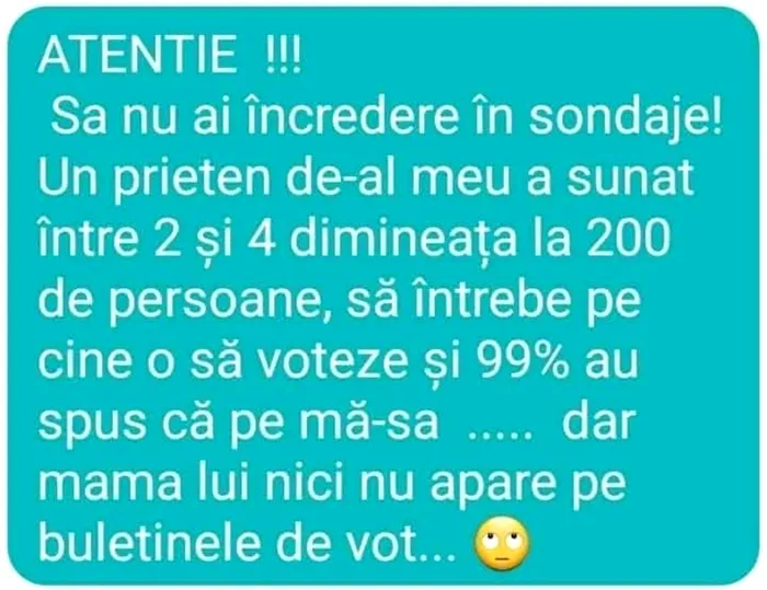 Un prieten de-al meu a sunat între 2 și 4 dimineața la 200 de personae, să întrebe pe cine o să voteze și 99% au spus că pe mă-sa…dar mama lui nu apare pe buletinele de vot…