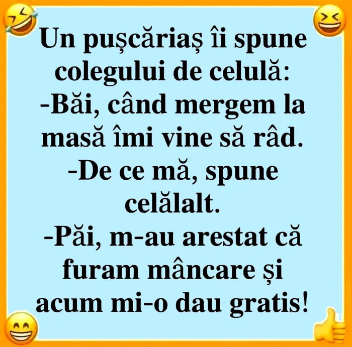 – Păi m-au arestat că furam mâncare și acum mi-o dau gratis.