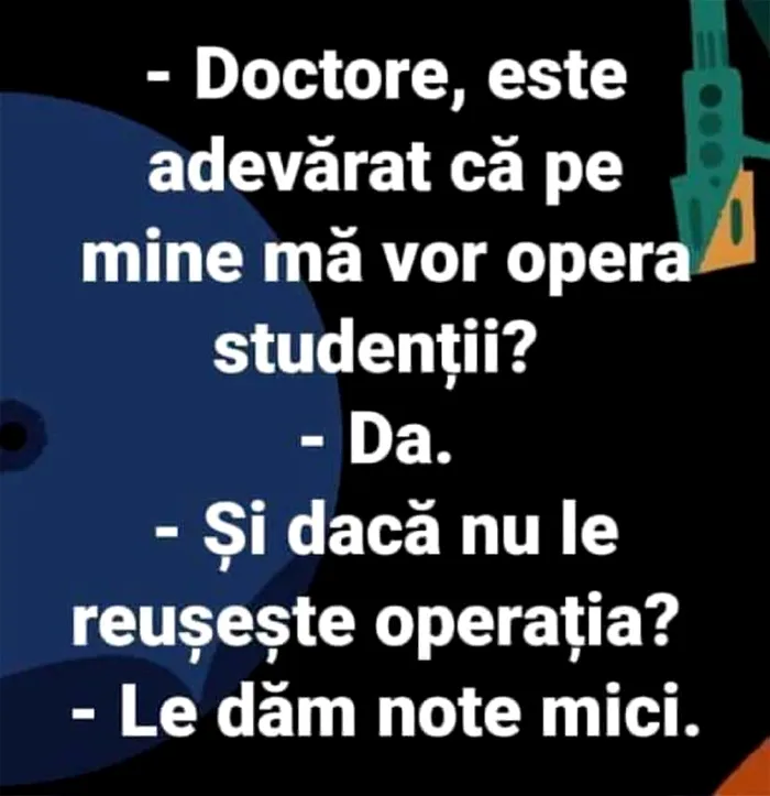 Dacă este sâmbătă, atunci ne vom delecta cu un nou banc care te va face să râzi cu lacrimi. Bancul zilei este despre un pacient care își întreabă medicul dacă va fi operat de către studenți. Răspunsul este unul cu adevărat savuros.