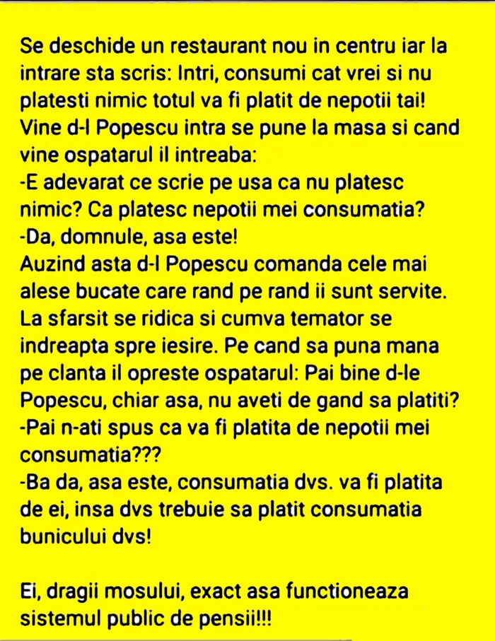 Se deschide un restaurant nou în centru, iar la intrare stă scris: Intri, consumi cât vrei și nu plătești nimic, totul va fi plătit de nepoții tăi!