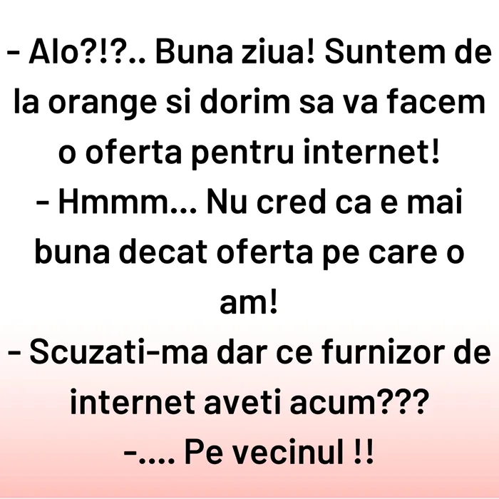 – Alo?!?.. Bună ziua! Suntem de la Orange și dorim să vă facem o ofertă pentru internet!