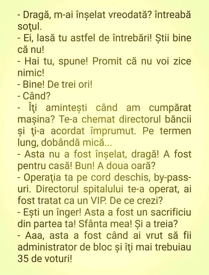 Prima pagină » Bancuri » BANCUL ZILEI | „Dragă, m-ai înșelat vreodată?”