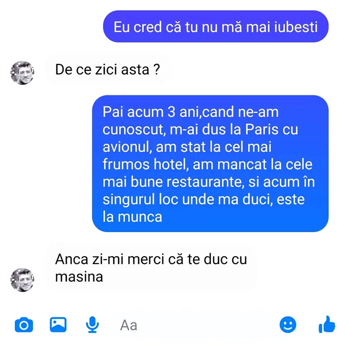 – Păi acum 3 ani, când ne-am cunoscut, m-ai dus la Paris cu avionul, am stat la cel mai frumos hotel, am mâncat la cele mai bune restaurante, și acum în singurul loc unde mă duci, este la muncă.
