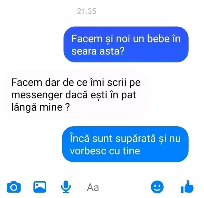 -Facem, dar de ce îmi scrii pe messenger, dacă ești în pat lângă mine?