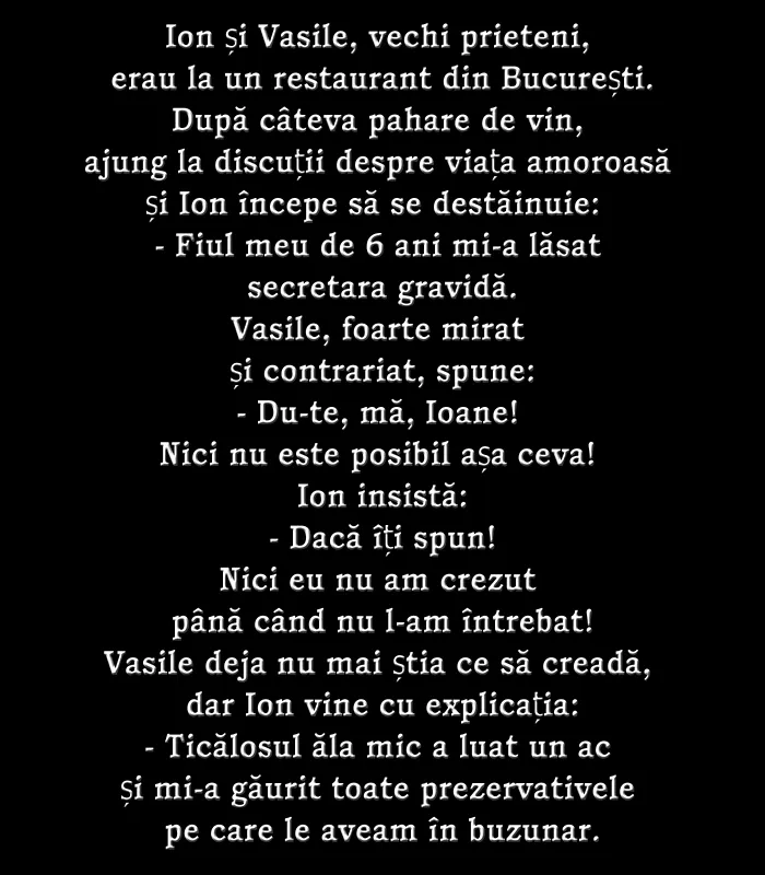 – Ticălosul ăla mic a luat un ac și mi-a găurit toate prezervativele pe care le aveam în buzunar.