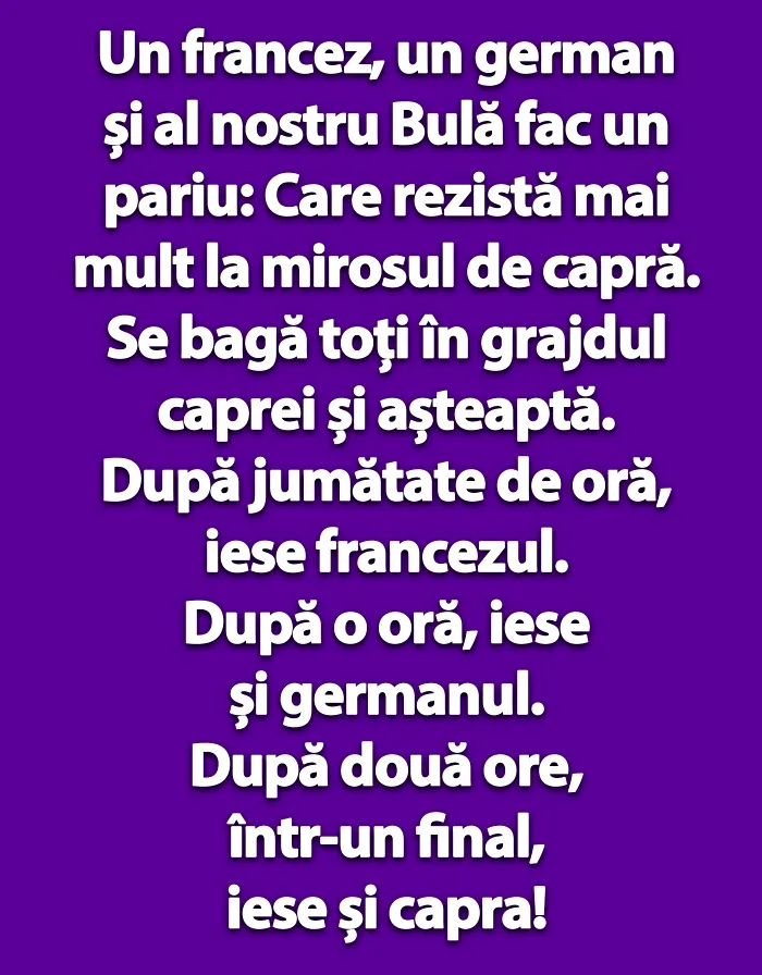 Un francez, un german și al nostru Bulă fac un pariu: Care rezistă mai mult la mirosul de capră. Se bagă toți în grajdul caprei și așteaptă.