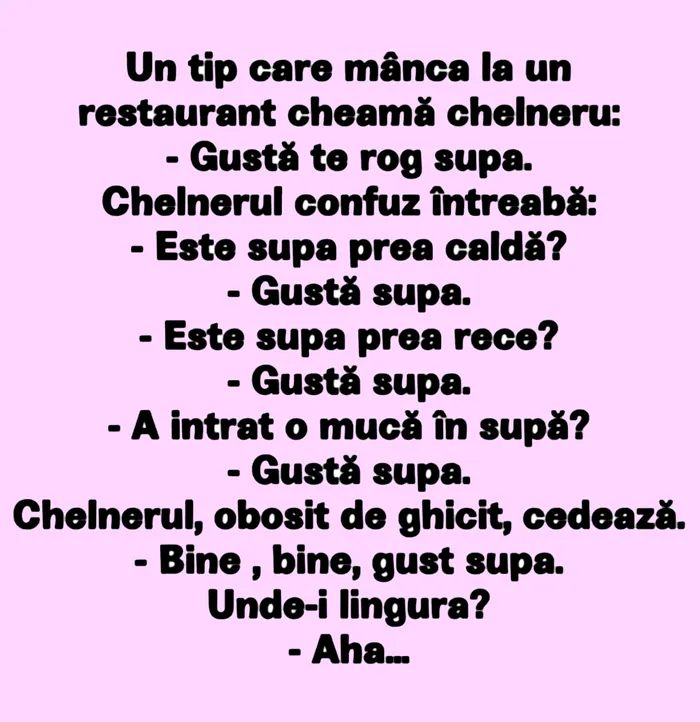 E weekend și trebuie să vă relaxați după o săptămână plină de griji și probleme. Gândul vă oferă un banc amuzant care o să vă însenineze dimineața. „Gustă supa!”.