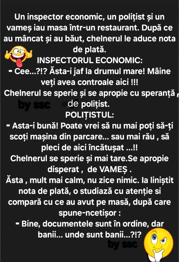 Chelnerul se sperie și mai tare. Se apropie disperat de vameș. Ăsta, mult mai calm, nu zice nimic. Ia liniștit nota de plată, o studiază cu atenție și compară cu ce au avut pe masă, după care spune-ncetișor: