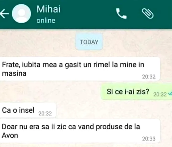 – Frate, iubita mea a găsit un rimel la mine în mașină.