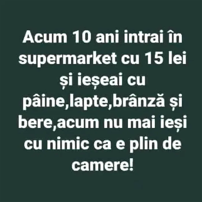 Acum 10 ani intrai în supermarket cu 15 lei și ieșeai cu pâine, lapte, brânză și bere, acum nu mai ieși cu nimic, că e plin de camere!
