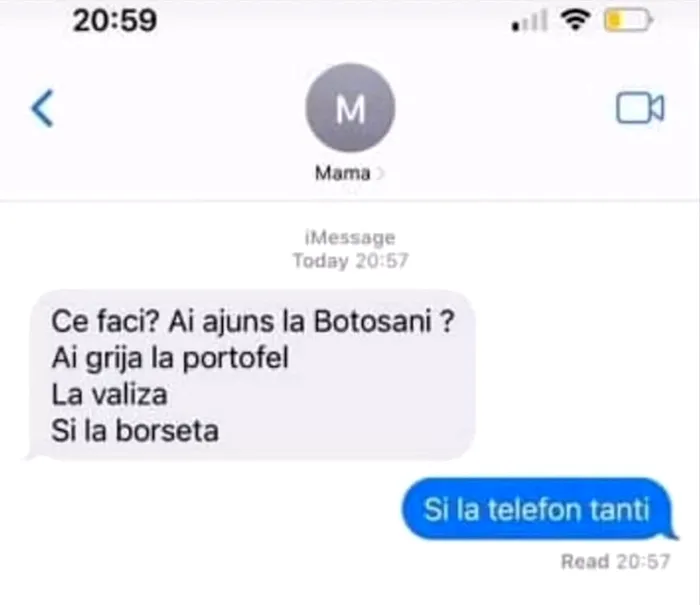 Bancul zilei. O mamă îi trimite copilului său un mesaj pe telefon, pentru a fi sigură că a ajuns la Botoșani. Și-a atenționat copilul să aibă grijă de lucruri, dar se trezește cu un mesaj neașteptat. Spor la râs!